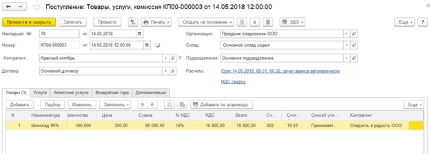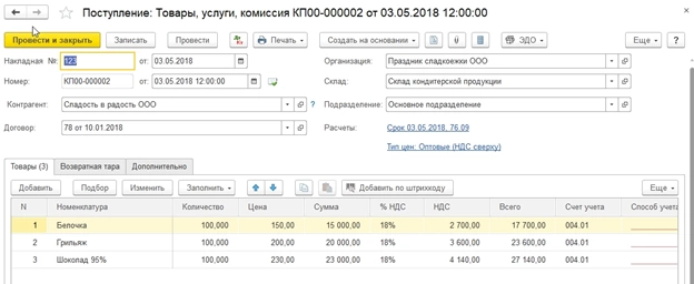 Здесь применяется договор комиссии на продажу, в табличной части содержится перечень взятых на комиссию товаров. Данный факт отмечается указанием забалансового счета бухучета 004.01 «Товары, принятые на комиссию/Товары на складе». Сформируется проводка Дт 004.01.