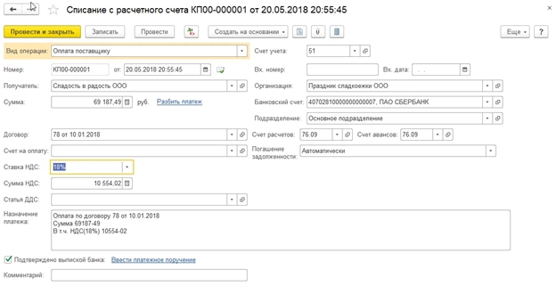 Готовится документ, доступный из полного интерфейса, раздел «Банк и касса». Особенностью заполнения этого документа является использование механизма ввода на основании для «Отчета комитенту». Здесь автоматом считается сумма платежа.