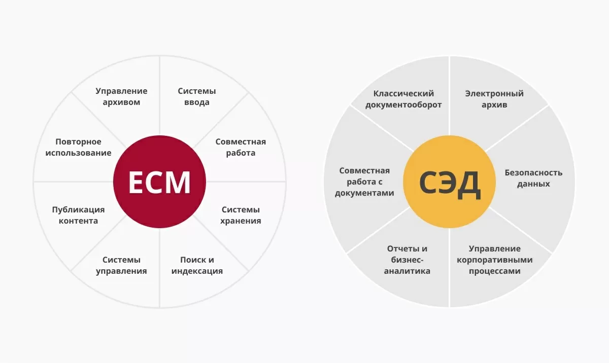 Многие решения, которые начинались как решения СЭД, обросли новой полезной функциональностью и превратились постепенно в системы класса ECM.