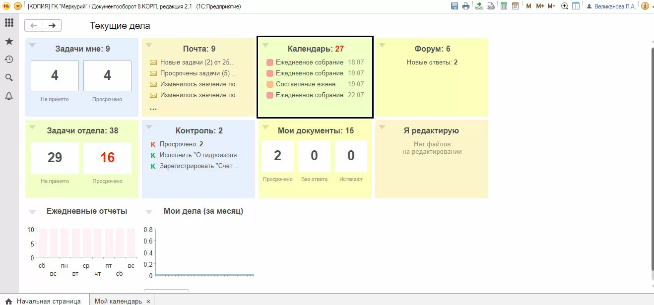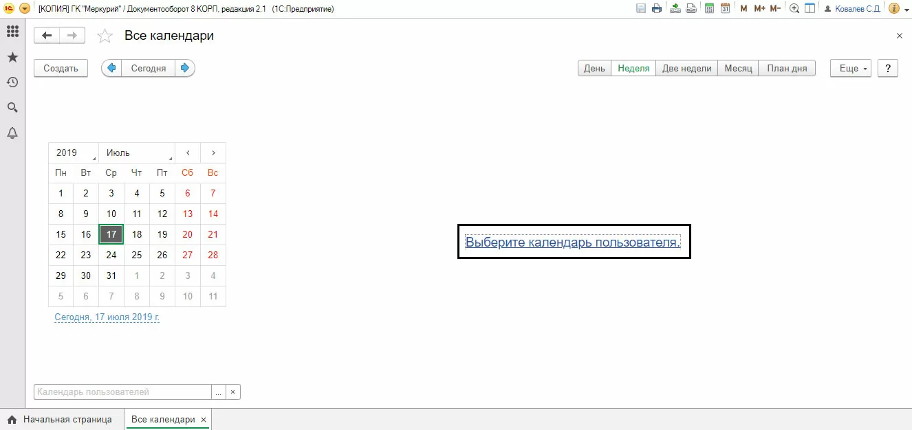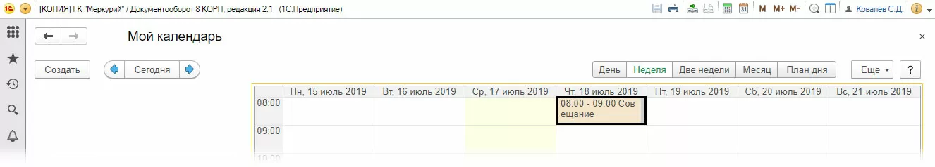 Рассмотрим календарь на примере программы «1С:Документооборот 8 КОРП, редакция 2.1». Перейти к календарю можно сразу при открытии программы с рабочего стола.
