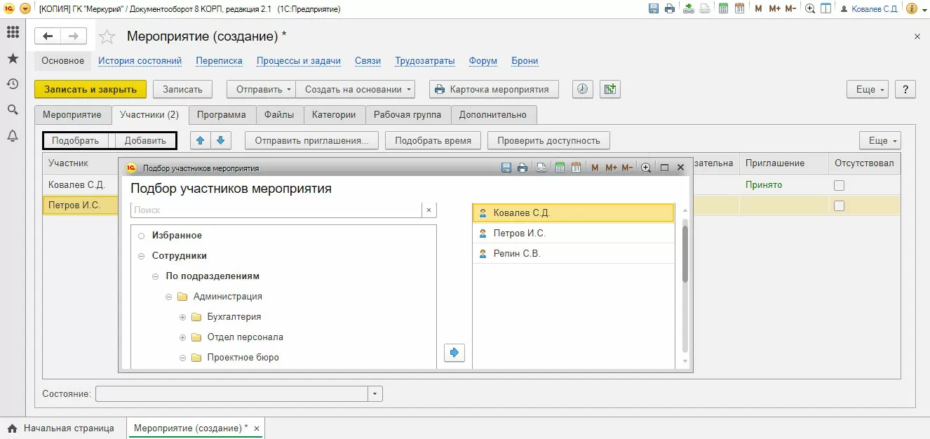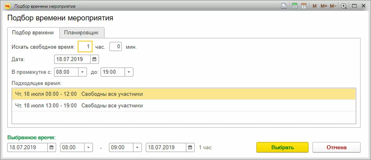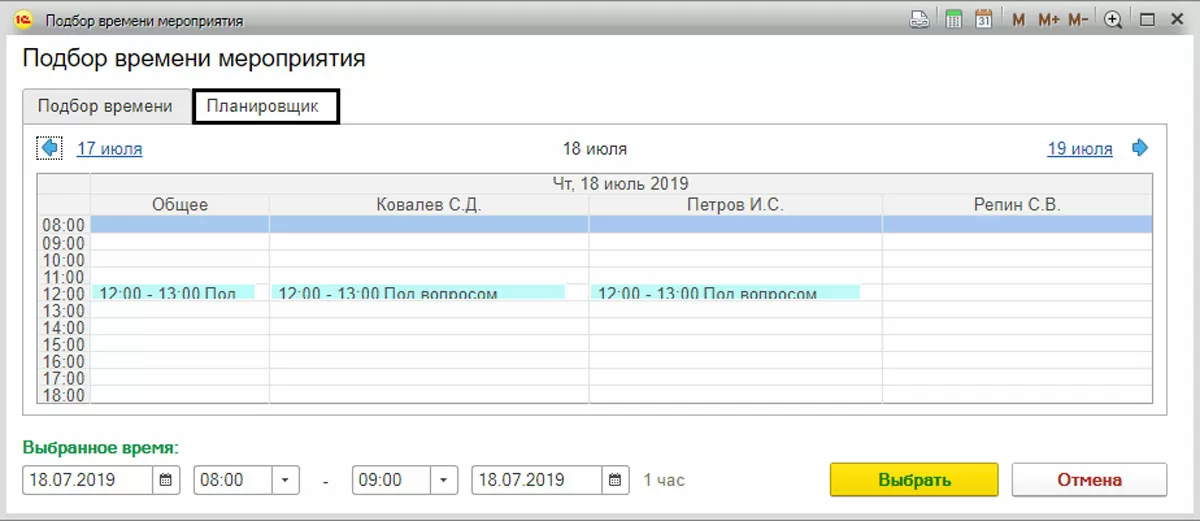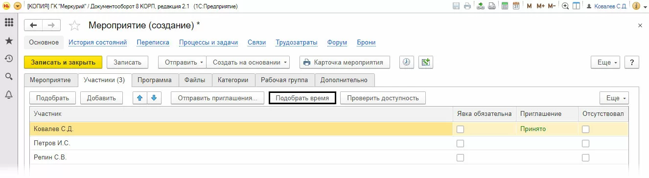 При создании мероприятия можно увидеть свободное время участников. То есть календарь подскажет при автоматическом подборе времени, когда сотрудники свободны – кнопка «Подобрать время».