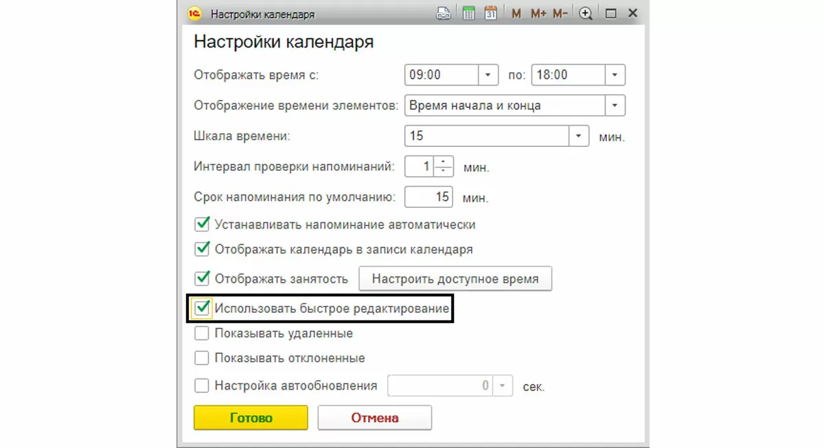 Например, установка галочки «Быстрое редактирование» позволяет вносить изменения непосредственно в календаре. При нажатии мышкой на ячейку всплывает строка, куда вносится информация о мероприятиях.