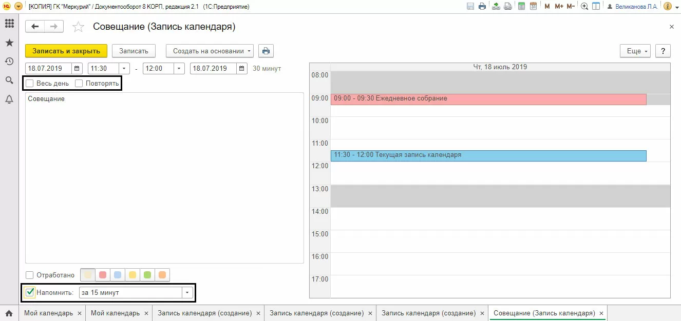 Например, указав участников мероприятия (на закладке «Участники»), у выбранных пользователей эти сведения будут отображены в их личном календаре.
