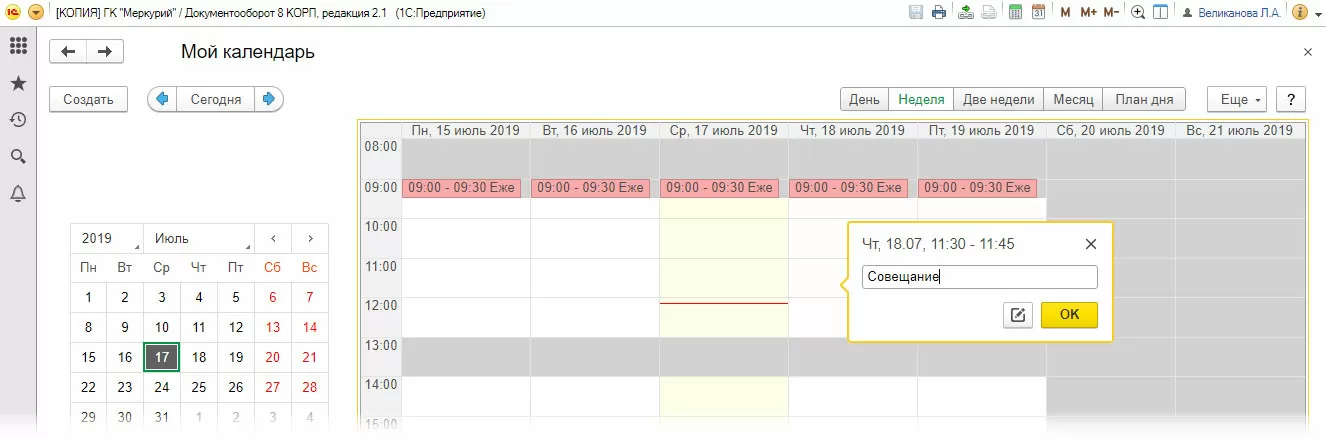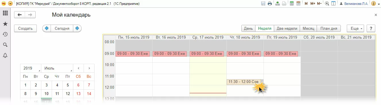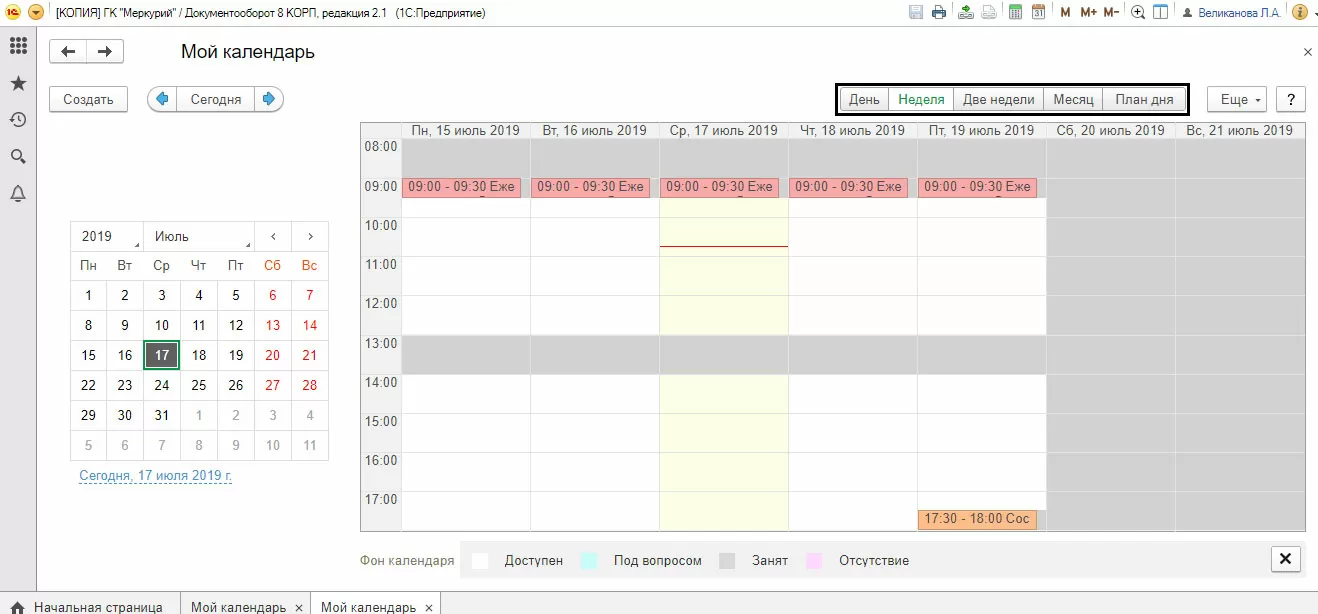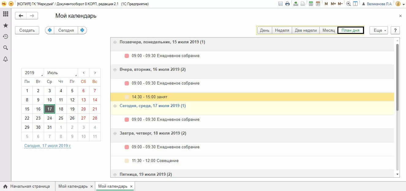 Открыв календарь, можно увидеть информацию о занятом и свободном времени, мероприятиях, отсутствиях и другие личные записи. Используя кнопки вверху календаря, можно настроить отображение его данных – за день, неделю, две недели, месяц, отобразить план дня.
