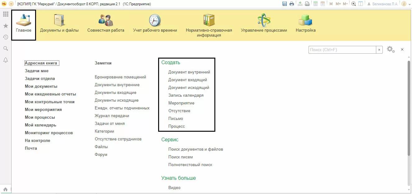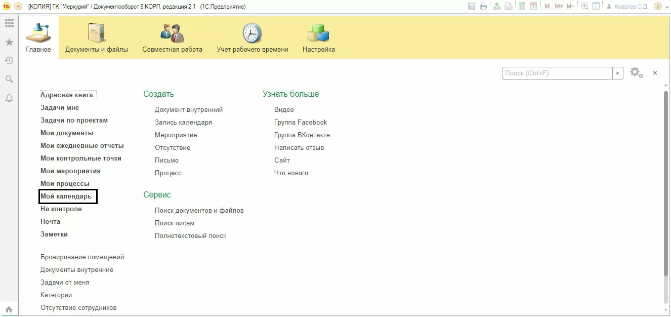 «Мой календарь» доступен также в разделе меню «Главное» и «Совместная работа».