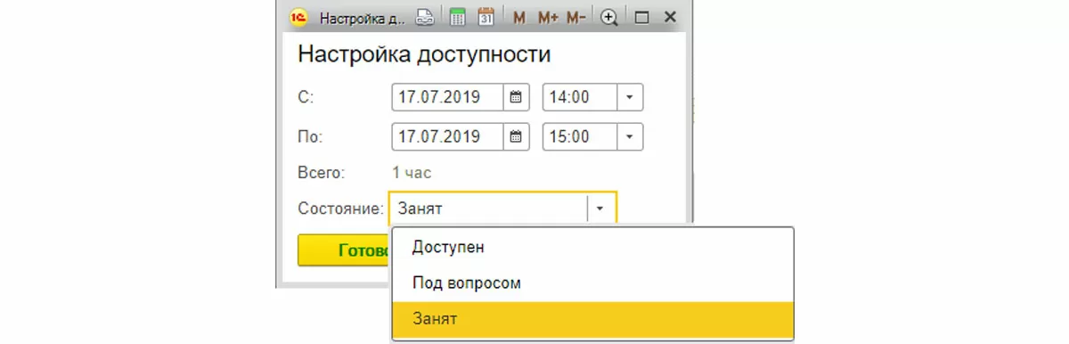 Чтобы в открывшейся форме настроить доступность, указываем дату, время и состояние.