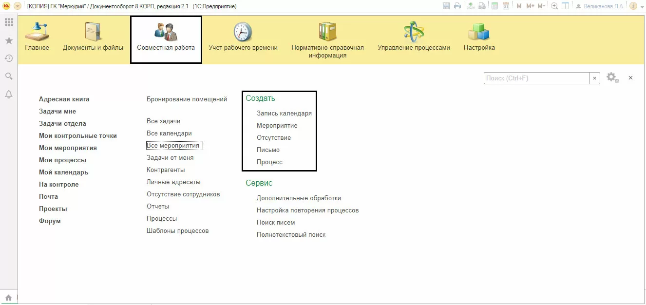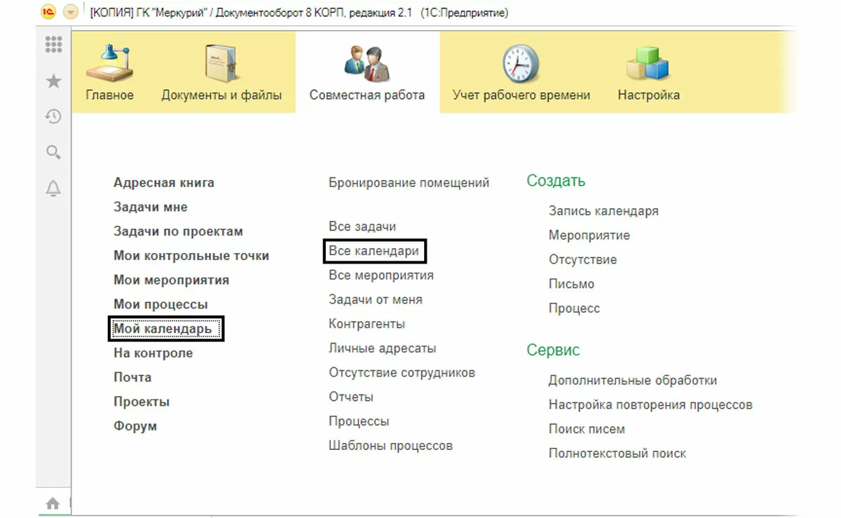 Кроме непосредственного внесения данных в календарь, можно использовать механизмы типа мероприятий в разделе «Совместная работа» или «Главное».