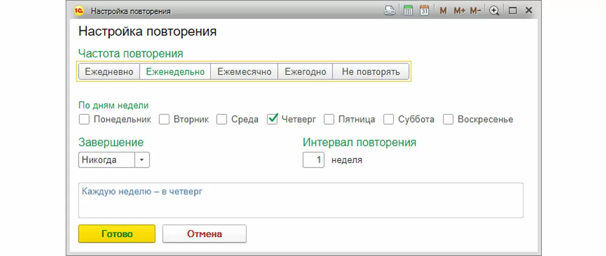 В настройке мероприятия можно установить напоминание, указать, что мероприятие занимает весь день, и сделать настройку повторения, указав частоту повторения. Например, ежедневное или еженедельное совещание.