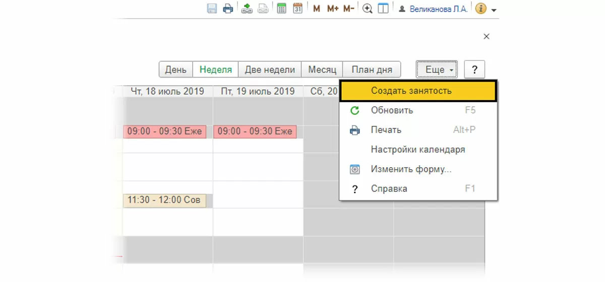 В настройке пользователь может указать временные интервалы, когда он занят или свободен. Для этого, нажав кнопку «Еще», необходимо выбрать команду «Создать занятость».