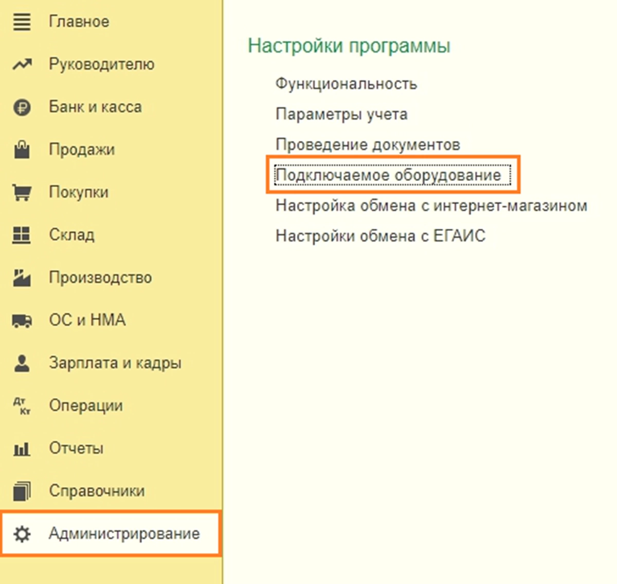 Фискальный регистратор является техническим устройством для печати чеков, обладает фискальной памятью, подключается к компьютеру и способен работать по сети. Путь по меню для подключения Администрирование => Подключаемое оборудование.