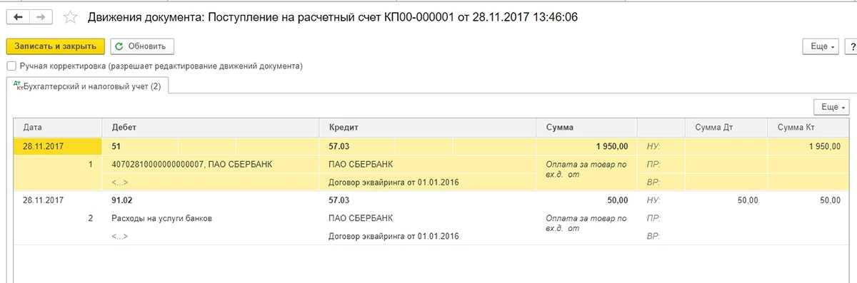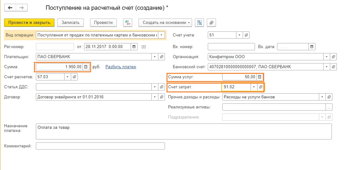 Чтобы отразить поступление денежных средств на расчетный счет, можно на основании проведенной операции создать документ Поступление на расчетный счет.