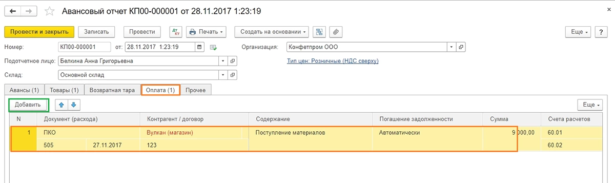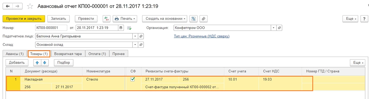 Если приобретаете единичный товар в розничном магазине, отражайте такую покупку в разделе Товары. Но допустим у вас ситуация, когда с одним и тем же поставщиком расплачиваетесь то наличкой, то по безналу. И хотите иметь корректные данные по расчетам, например, для формирования акта сверки. Тогда накладные и счет-фактуры, полученные от этого поставщика в день покупки за наличный расчет, можно провести отдельно от авансового расчета документом Поступление (акты, накладные), а в авансовом отчете отразите реквизиты ПКО, т.е. документ оплаты на вкладке Оплата.