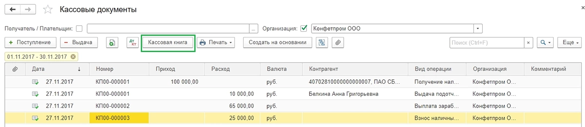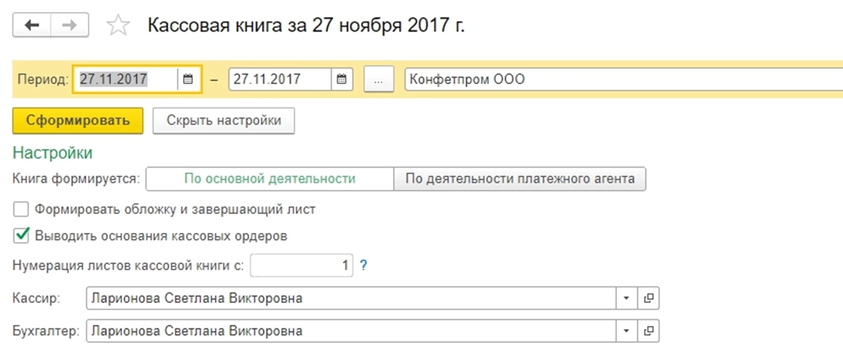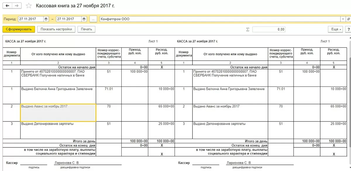 На основании ПКО и РКО, проведенных за день, сформируем кассовую книгу (Рисунок 21), которая представляет собой отчет по проведенным кассовым операциям.