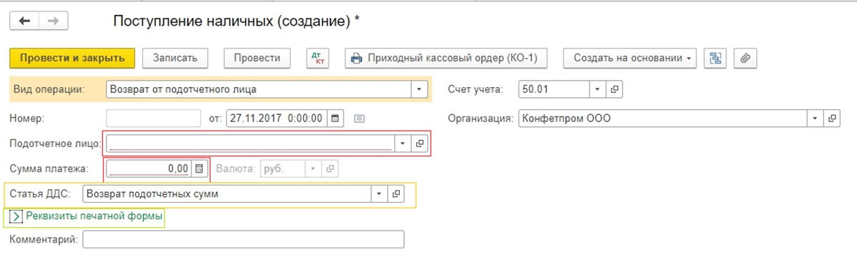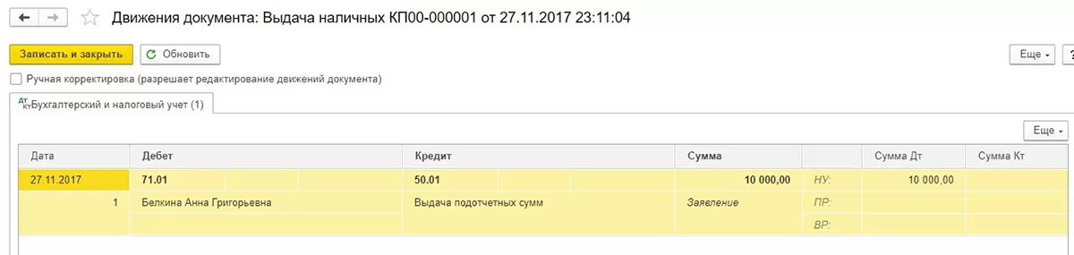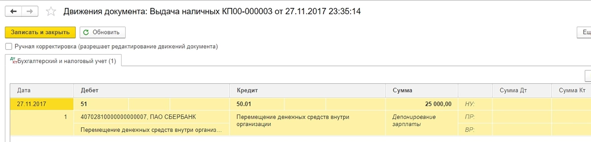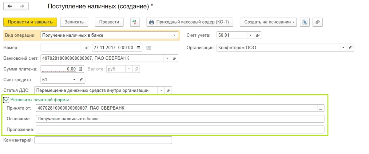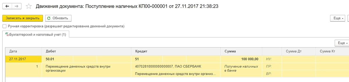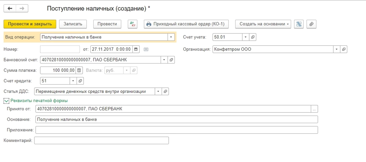 Следует отметить, что в данном случае отражено движение денег не только по кассе, но и по расчетному счету. Чтобы не получилось двойного списания денег с банковского счета, проводки вида Дт 50.01 – Кт 51 формируются кассовыми, а не банковскими документами.