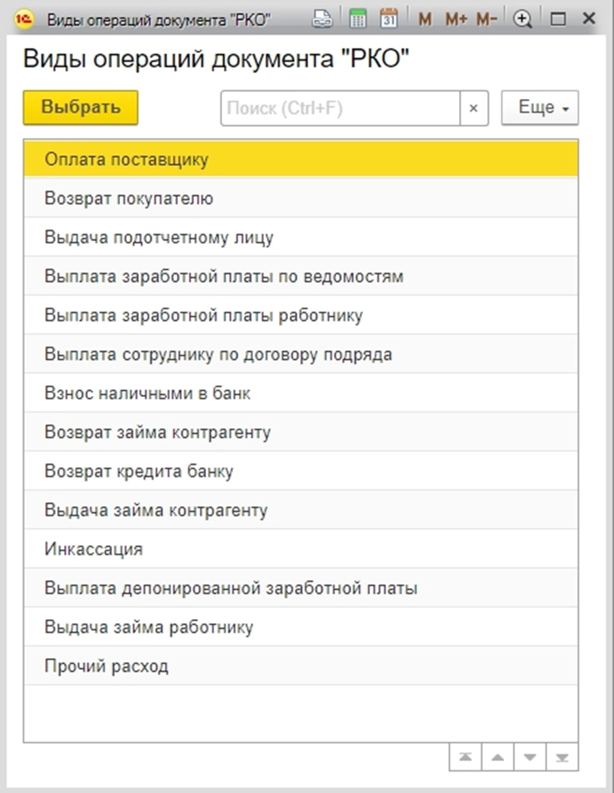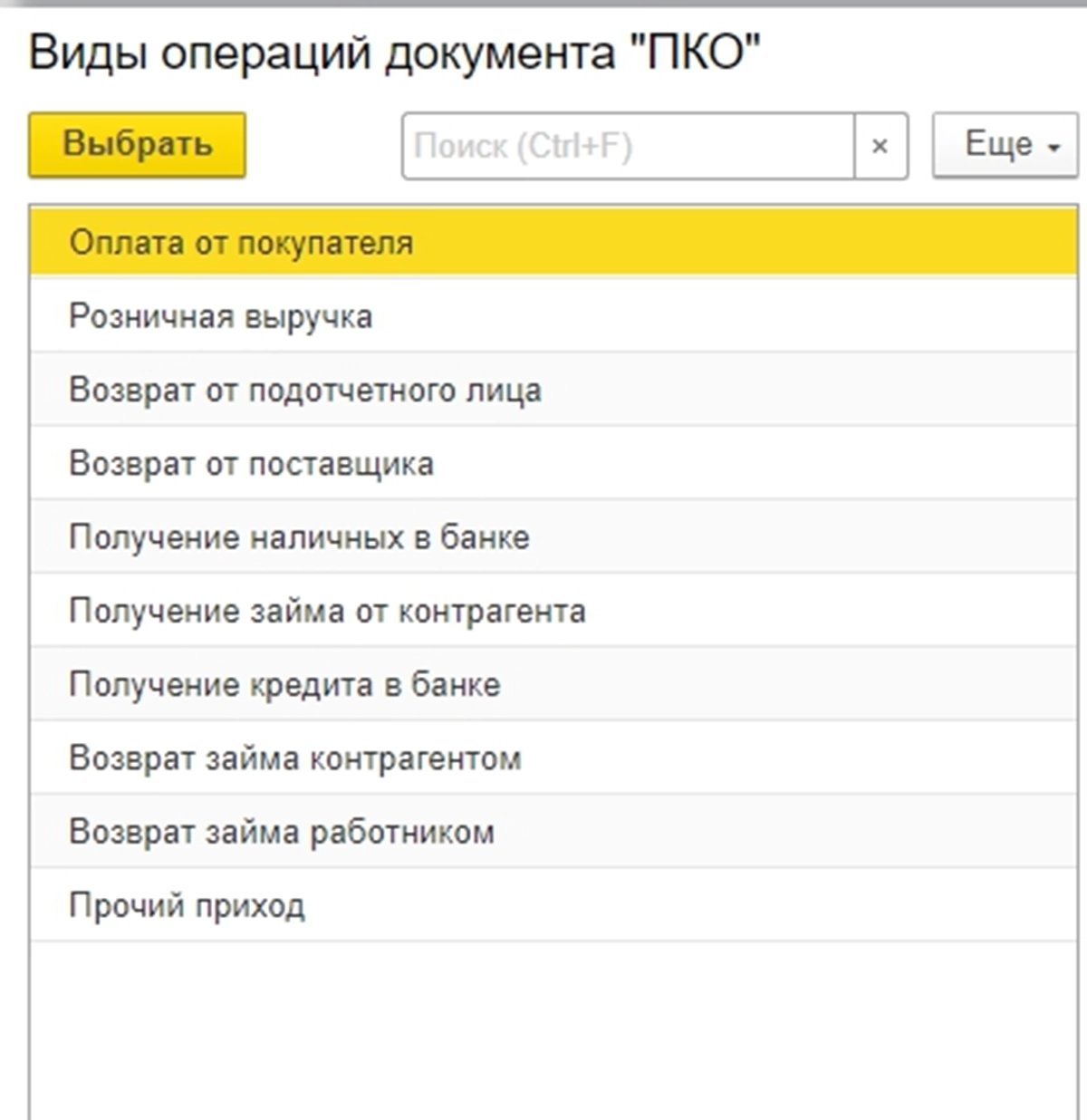 В 1С предлагается десять видов ПКО в зависимости от вводимой операции. Они следующие: