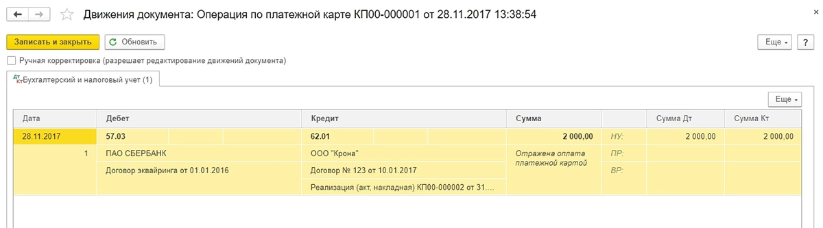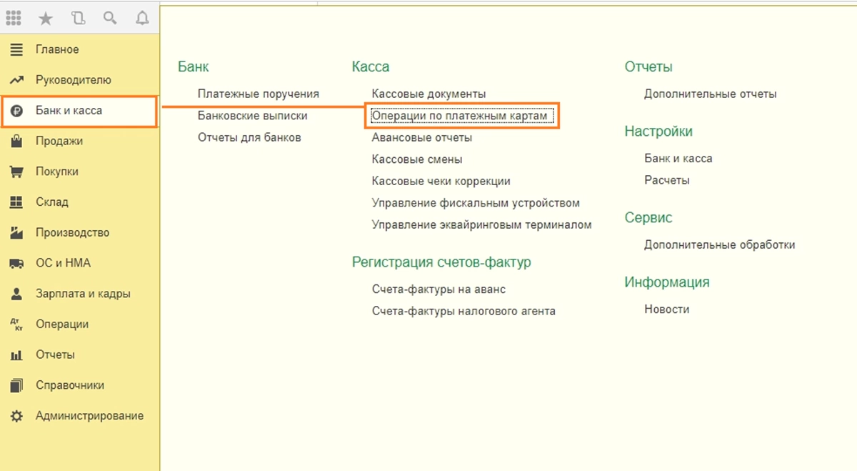 Путь по меню: Банк и касса => Касса => Операции по платежным картам.