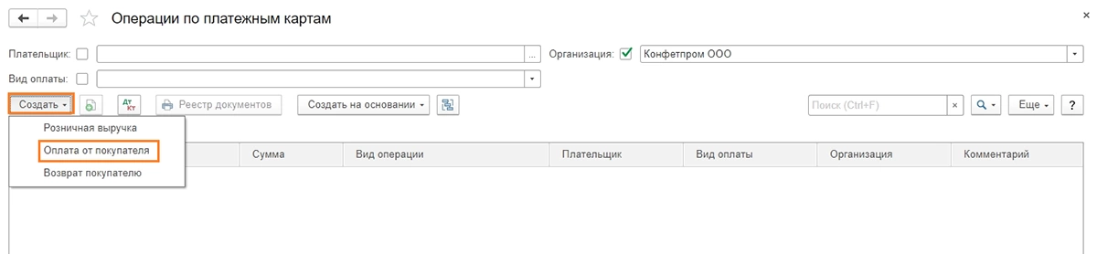 По кнопке Создать возможны три варианта документа. Выбираем Оплата от покупателя, т.к. этот документ настроен на отражение оплаты от юридических лиц и ИП. Операции по платежным картам для розничной торговли выходят за рамки данной статьи.