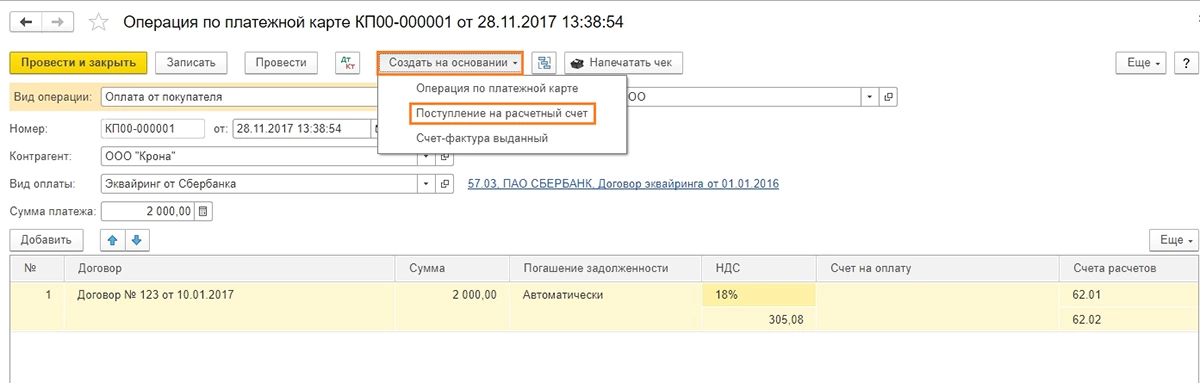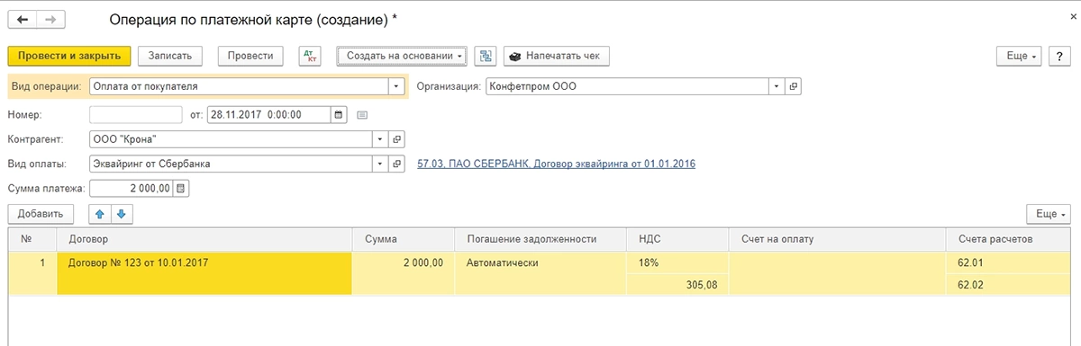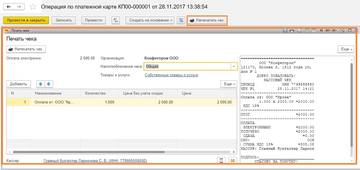 После подключения фискального регистратора становится возможна печать чеков, например, из документов ПКО или Операция по платежной карте.
