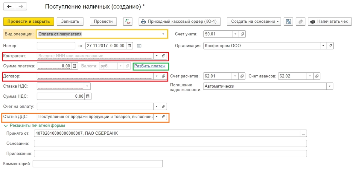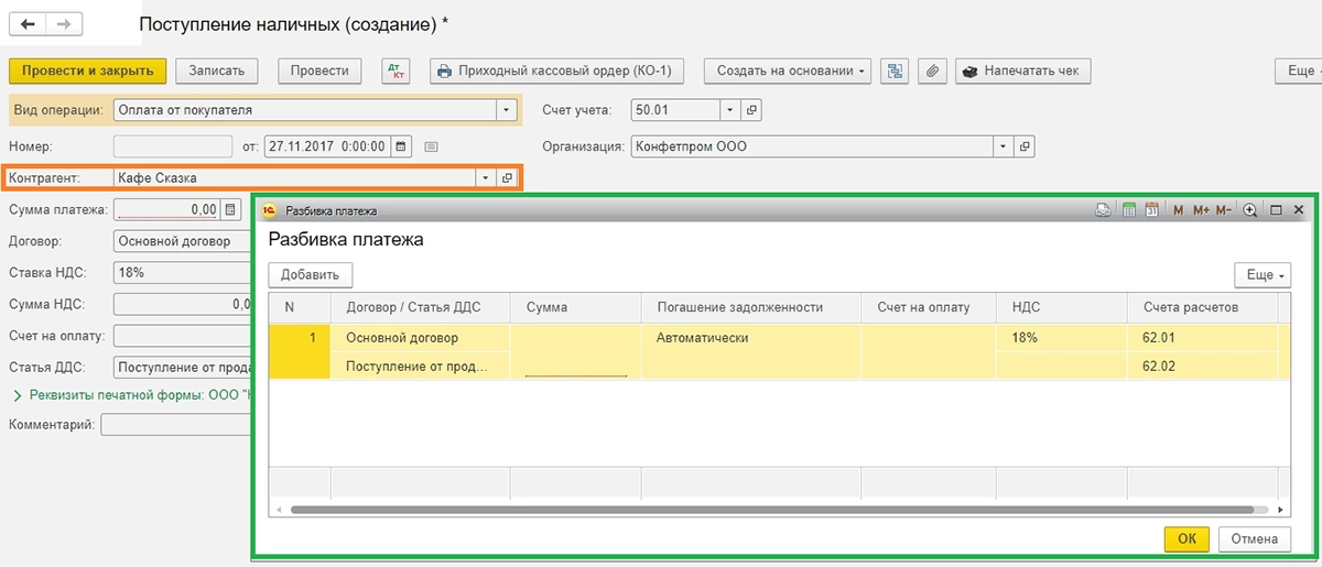 Если надо указать больше чем один договор, воспользуйтесь функцией Разбить платеж, которая позволяет заполнить данные по нескольким договорам. В таком случае после выбора контрагента следует открыть табличную часть Разбивка платежа, выбрать договоры и указать суммы по каждому. Общий итог отразится в ПКО.