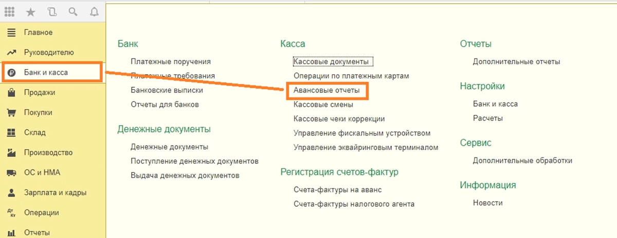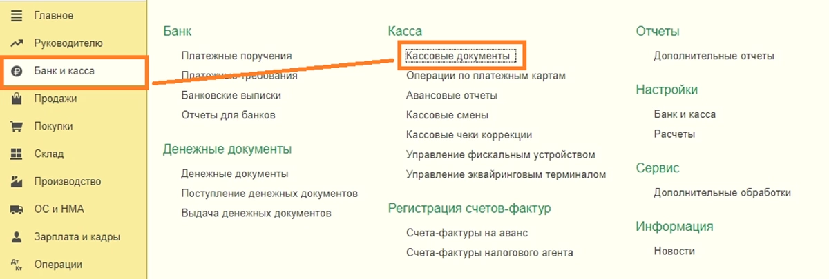 В зависимости от версии программы настройки меню могут несколько отличаться, но в любом случае в разделе Банк и касса вы сможете получить доступ к основным кассовым документам – ПКО и РКО.