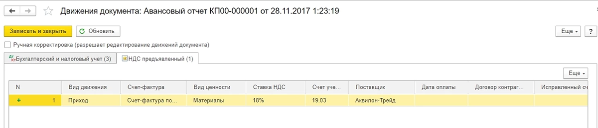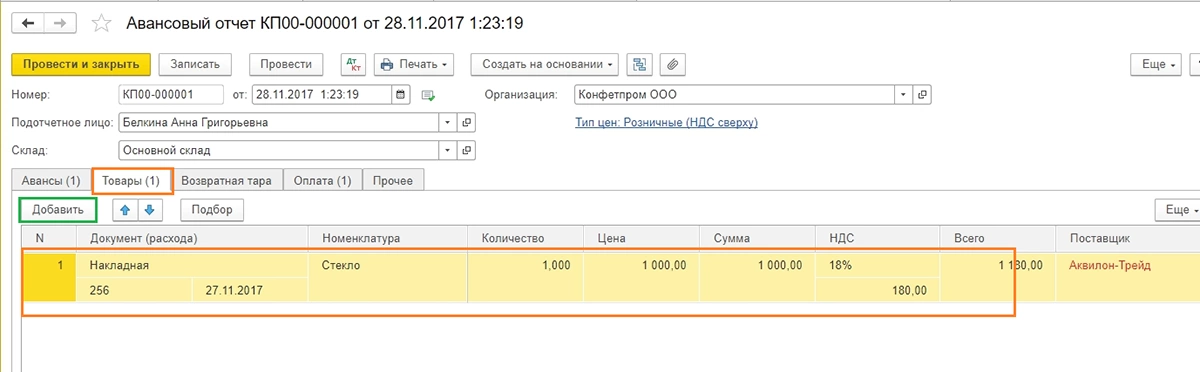 Вкладку Товары заполняем данным о приобретенных товарах или материалах. Если в документах выделен НДС, указываем эти данные в авансовом отчете.