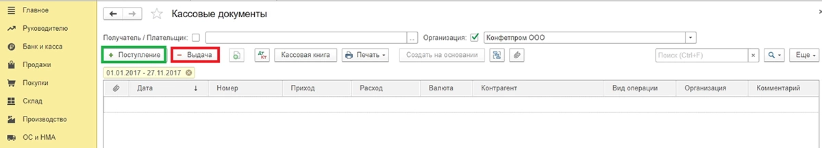 Выбираем пункты меню Банк и касса => Касса => Кассовые документы