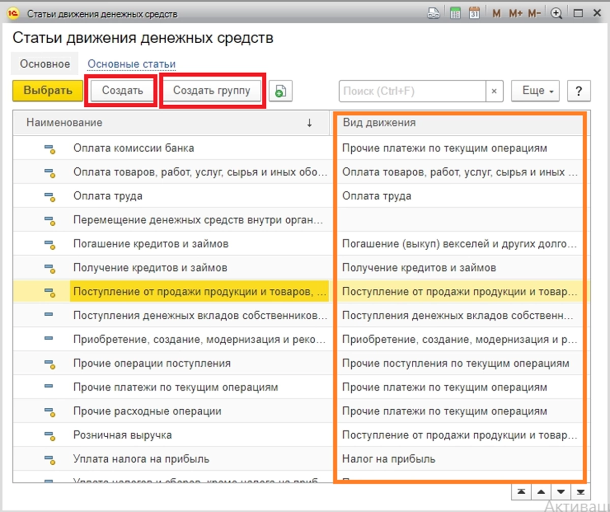 Значение поля Статья ДДС заполняется из справочника. Данный справочник позволяет добавить Наименование статьи ДДС, а вот значение Вид движения для редактирования недоступно. Если наименований слишком много и хочется сгруппировать их по папкам, следует воспользоваться кнопкой «Создать группу». Заполненное значения поля в дальнейшем будет учитываться при формировании отчетной формы № 4 «Отчет о движении денежных средств».