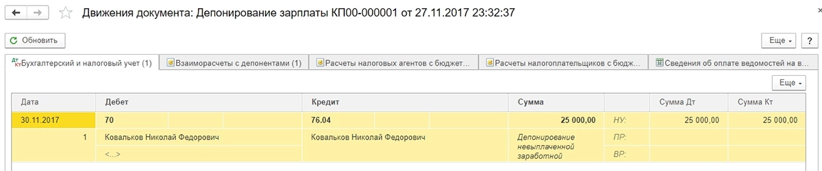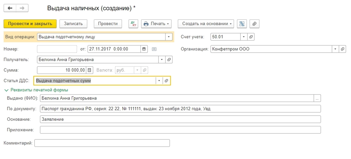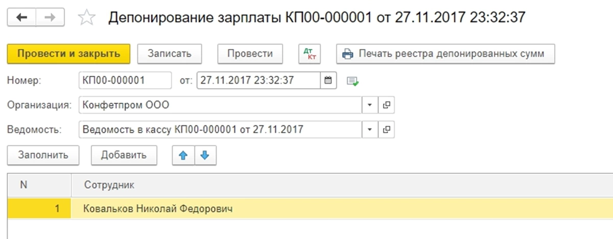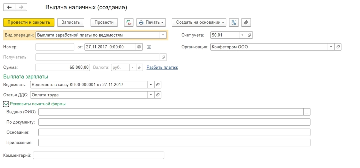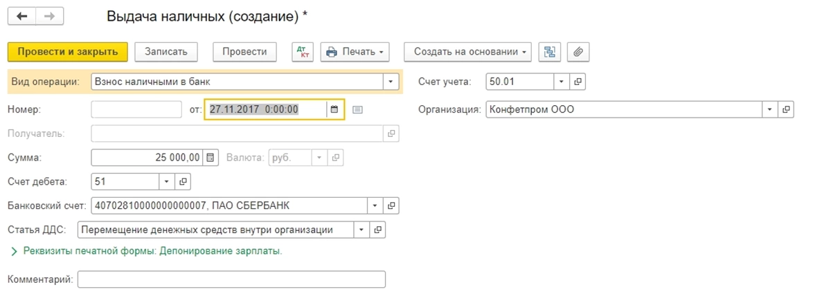 Возвращаемся в ведомость и по кнопке Создать на основании формируем документ Выдача наличных . Сумма будет пересчитана автоматически и станет меньше на депонированные суммы.