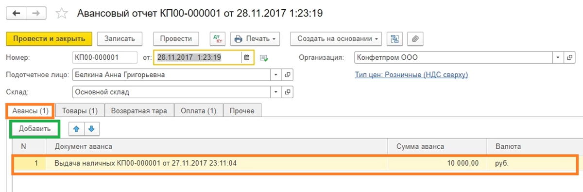 Табличная часть содержит несколько вкладок. Вкладку Авансы заполняем на основании выданного РКО.