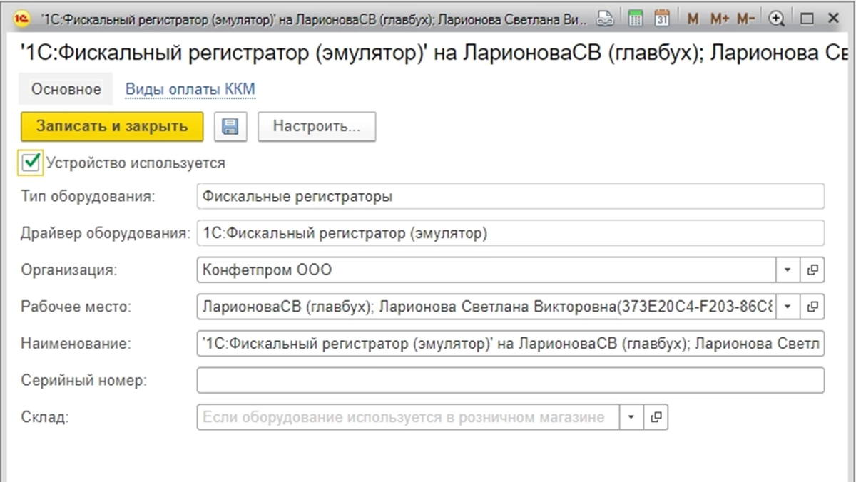 Если реального регистратора нет в наличии, для тестовых целей можно использовать эмулятор от 1С. Пример заполнения данных приведен ниже на рисунке 41.