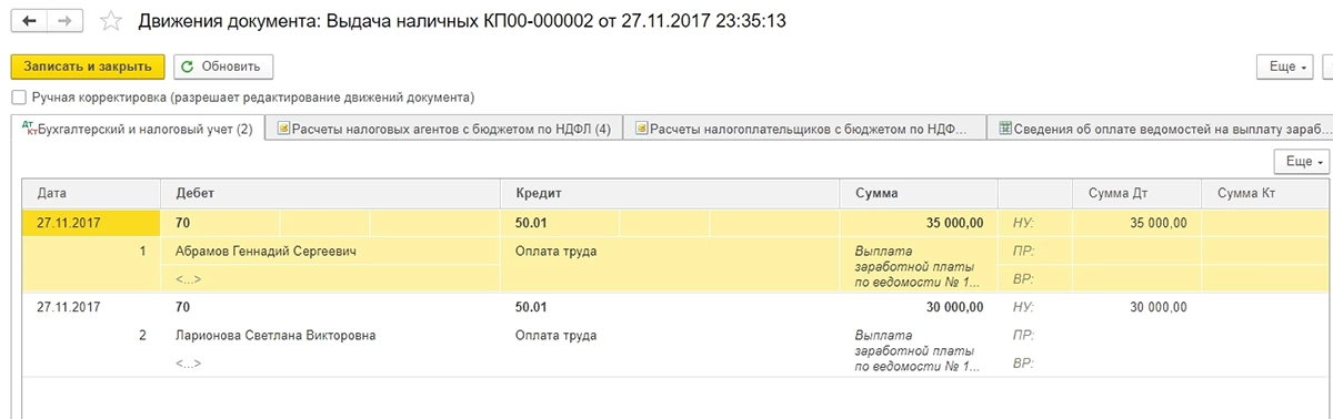 Проводки по выдаче зарплаты сформировались по двум сотрудникам, так и должно быть.