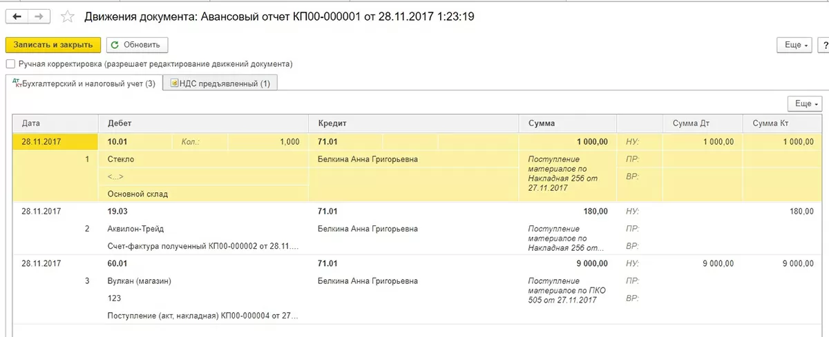 Название документов отражают их суть и имеют соответствующие настройки, например Возврат от подотчетного лица по умолчанию будет иметь корреспонденцию со счетом 71.