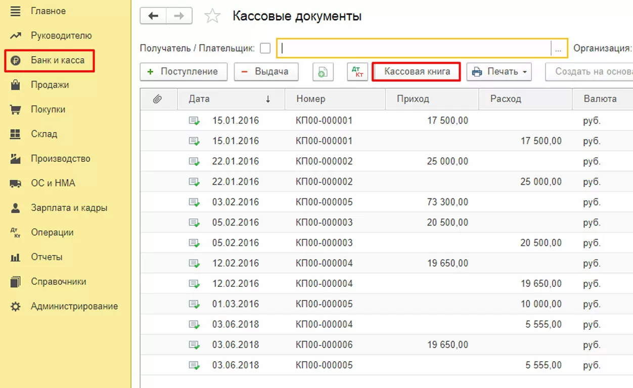 Открыть книгу для настроек и печати можно из раздела 1С Бухгалтерия «Банк и касса», далее зайти в подраздел, называемый «Кассовые документы», и нажать кнопку «Кассовая книга».