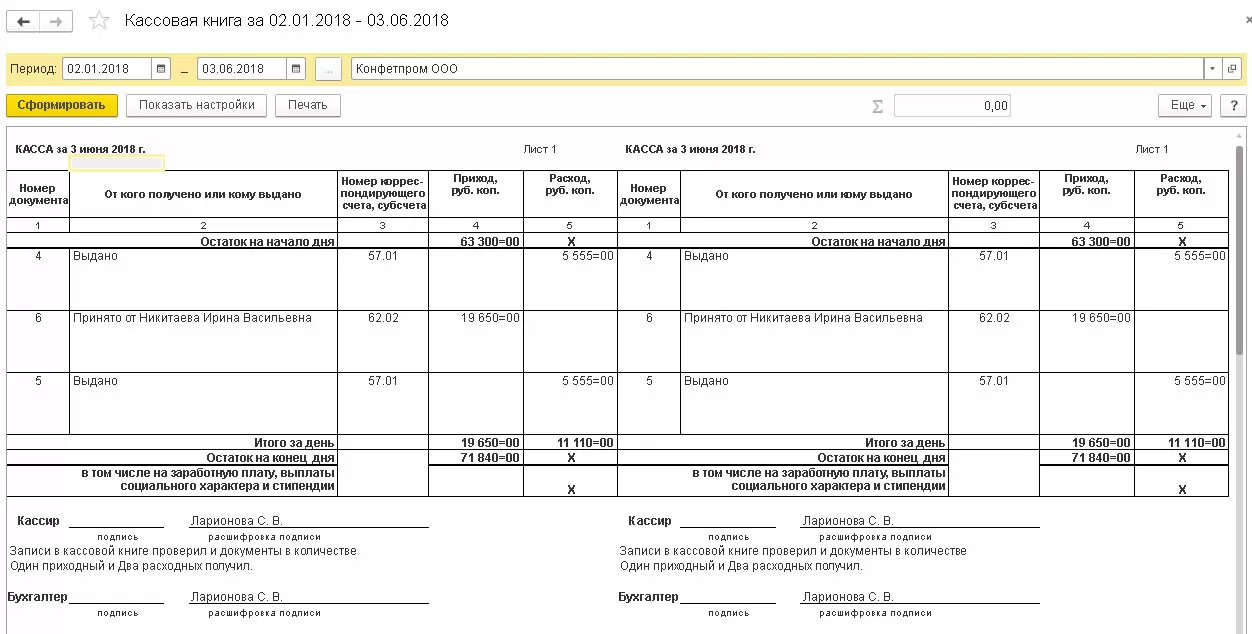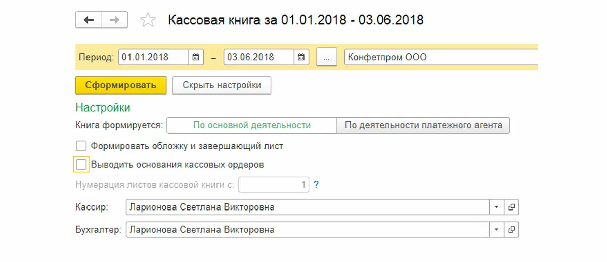 Для вывода в книге лиц, подписывающих кассовый документ, заполняется «Кассир» и «Бухгалтер» в соответствующих полях настроек отчета.