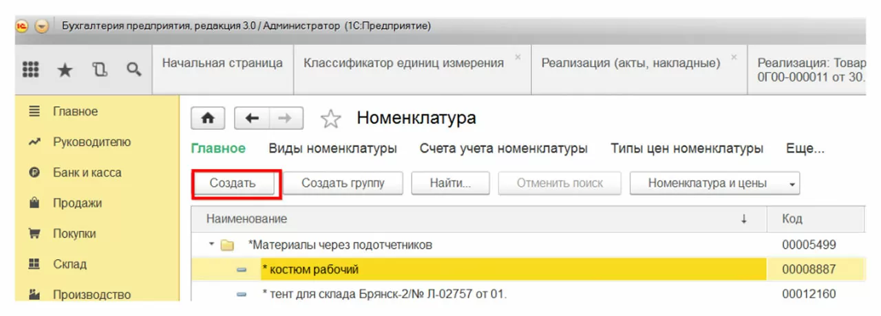 Чтобы создать новую номенклатуру, следует нажать кнопку «Создать», и на экране открывается меню создания номенклатуры.