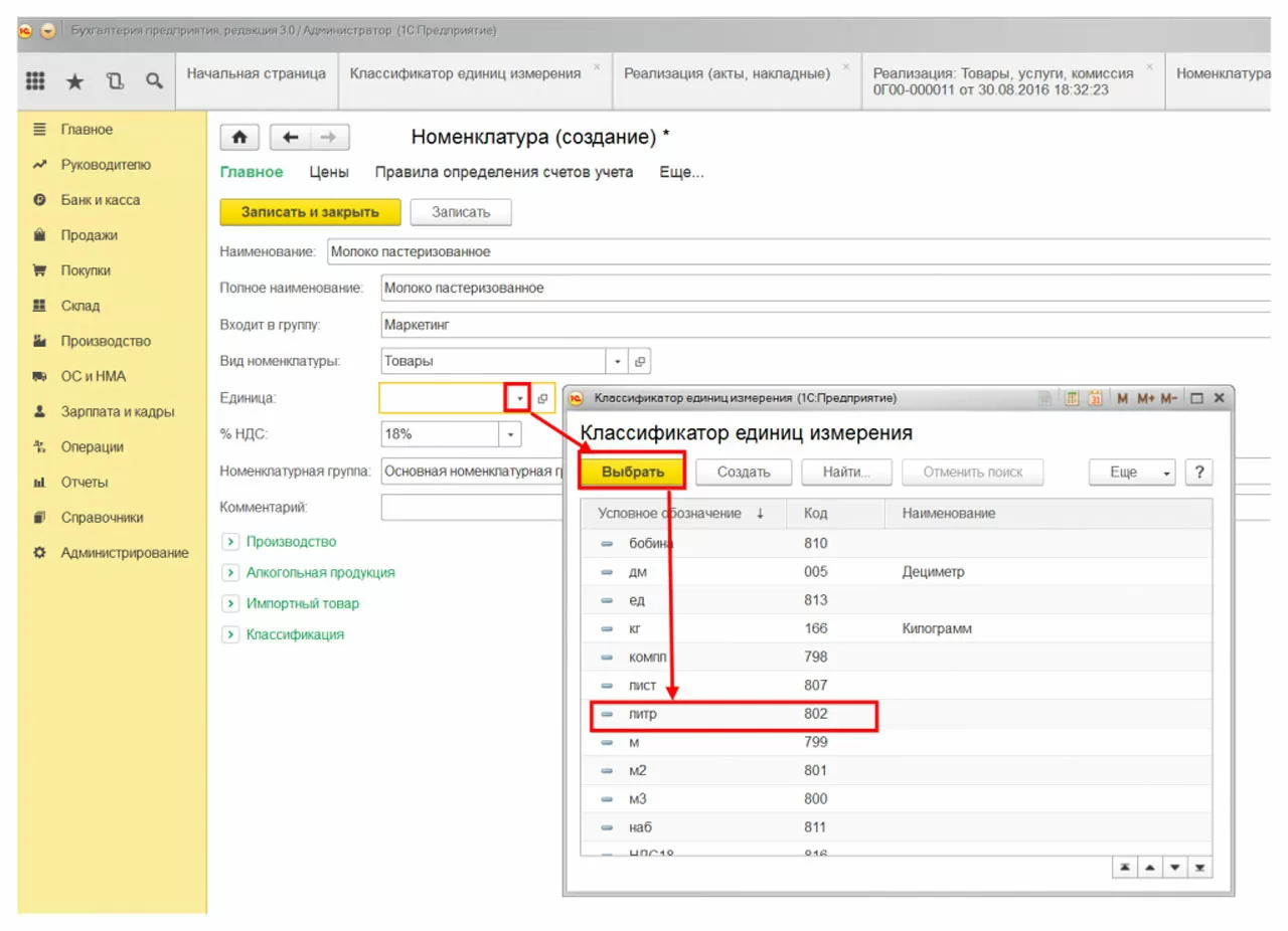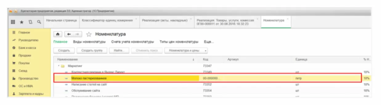 И в программе 1С для автоматизации бухгалтерского учета появляется нужная нам номенклатура с определенной, выбранной нами, единицей измерения.