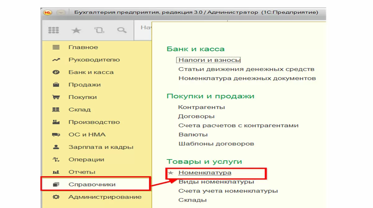 Для правильного проставления кодирования номенклатуры в ПП «1С Бухгалтерия» открываем через меню справочников «Номенклатуру».