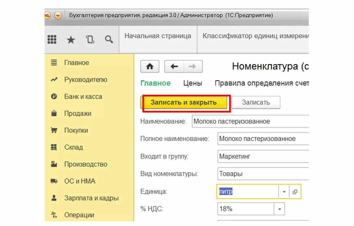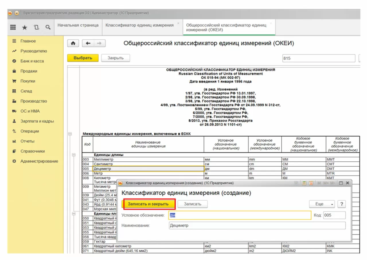 Для добавления нужной нам единицы, наводим курсор на наименование, и программа предлагает варианты работы со справочником. Если выбор сделан, жмем «Записать и закрыть», а также закрываем ОКЕИ.