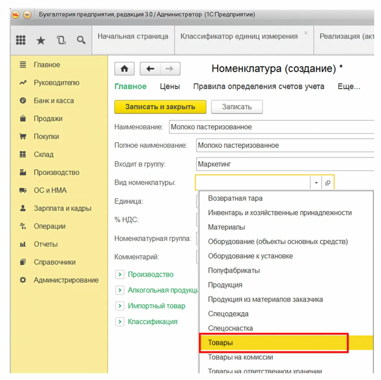 После заполнения наименования следует выбрать «Вид номенклатуры», например, «Товар» и его единицу измерения.