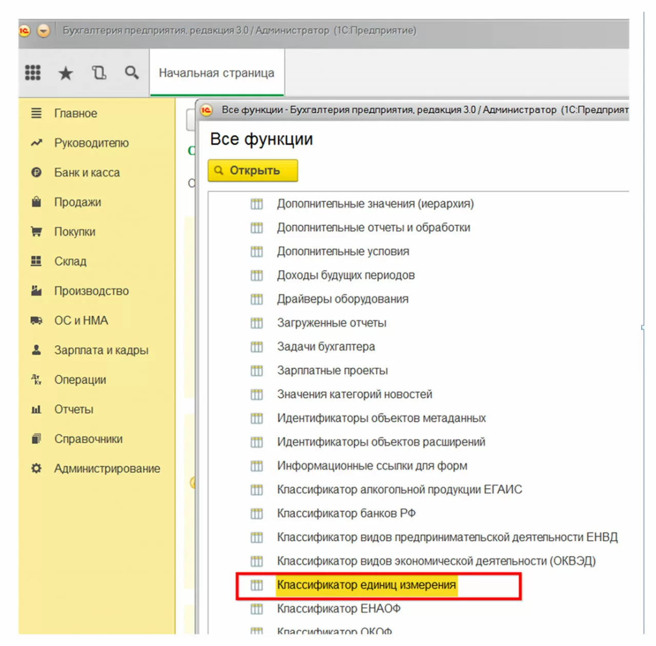 Общероссийский классификатор единиц измерения 1С содержит изначально: мы можем его увидеть и работать с ним, если открыть меню «Все функции» на основном рабочем столе программы.