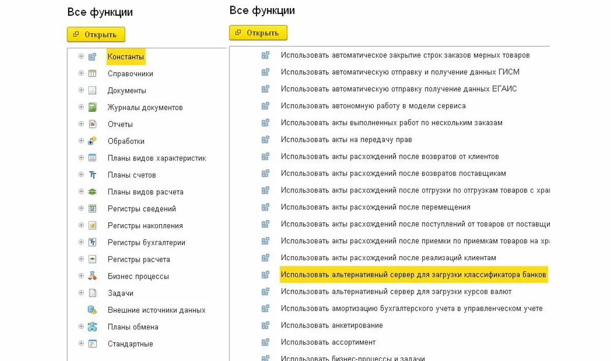 - В случае проблемы с серверами 1С, существует возможность использовать альтернативный сервер для случаев, когда нет связи с серверами 1С. Через меню «Все функции» нужно выставить значение переменной «Использовать альтернативный сервер для загрузки классификатора банков» в значение «истина»;