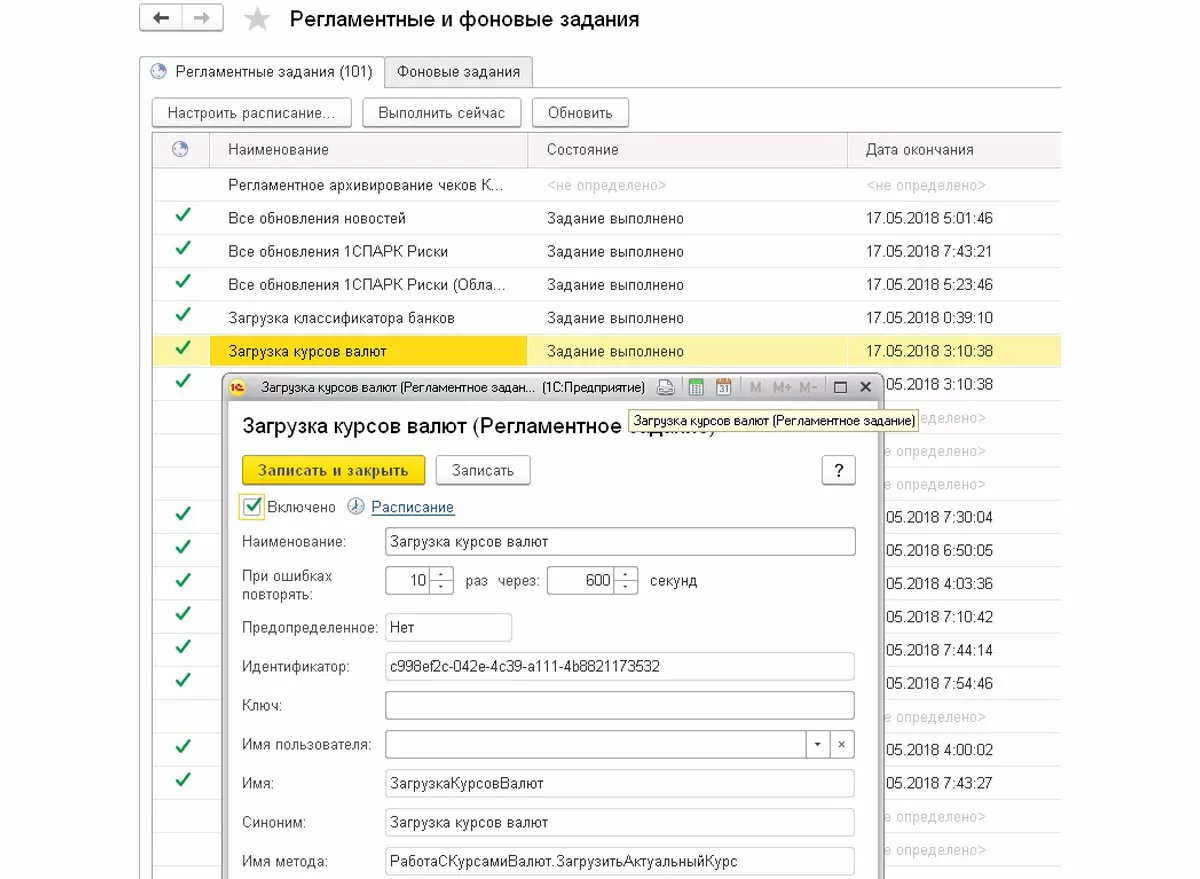 Чтобы отключить загрузку классификатора для высвобождения памяти или оперативной загрузки данных в ручном режиме, необходимо открыть нужное регламентное задание 1С. Сверху находится пункт «Включено» рядом с галкой, которую и нужно снять, после чего записать изменения в информационную базу. Делайте это осознанно, ведь подобное действие означает, что вы берете на себя поддержку классификатора в актуальном состоянии. Если вы не уверены в своих силах, обратитесь к нашим консультантам 1С, оставив заявку на сайте или по телефону. Мы с радостью вам поможем.