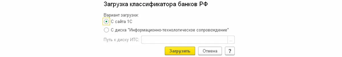 - Далее необходимо нажать на кнопку «Загрузить классификатор…». В появившемся окне необходимо выбрать вариант загрузки – через официальный сайт 1С или из файла, поставляемого на диске ИТС. Естественно, на сайте находится более точная информация, но в некоторых случаях поставляемые диски ИТС единственный выход;