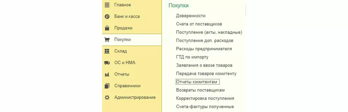 Итак, товар на комиссии продан. Нужно отчитаться перед поставщиком через «Отчет комитенту». Ищем в «Покупках» одноименный документ.