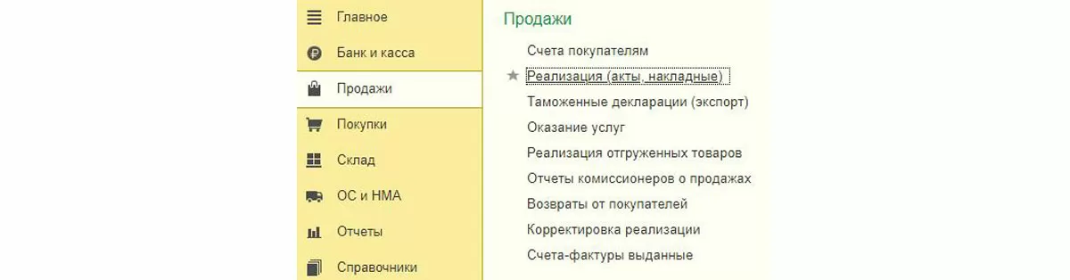 Рассмотрим процесс оформления документов реализации. Из главного меню идем в «Продажи-Реализация (акты, накладные)».