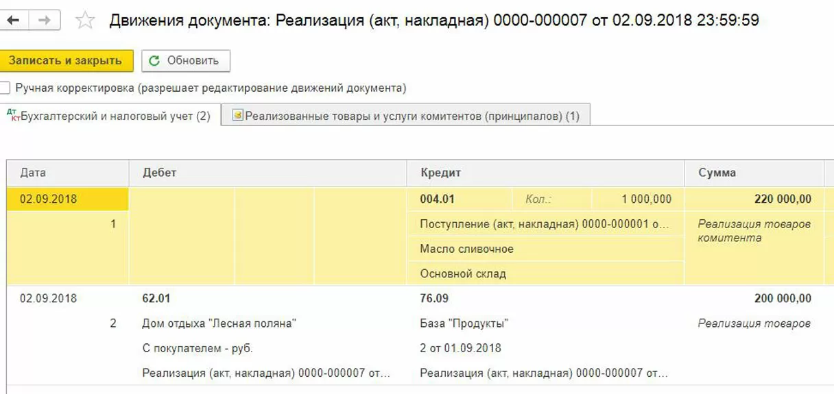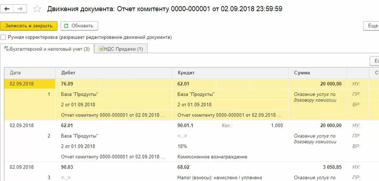 На вкладке «Товары и услуги» нажимаем «Заполнить», и заполняем товары из поступления от комитента. Суммы на главной вкладке заполнились автоматом. Нажимаем «Провести» и контролируем проводки. Итак, товар продан, а также получено вознаграждение за услугу.