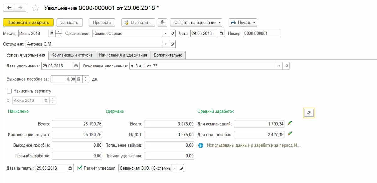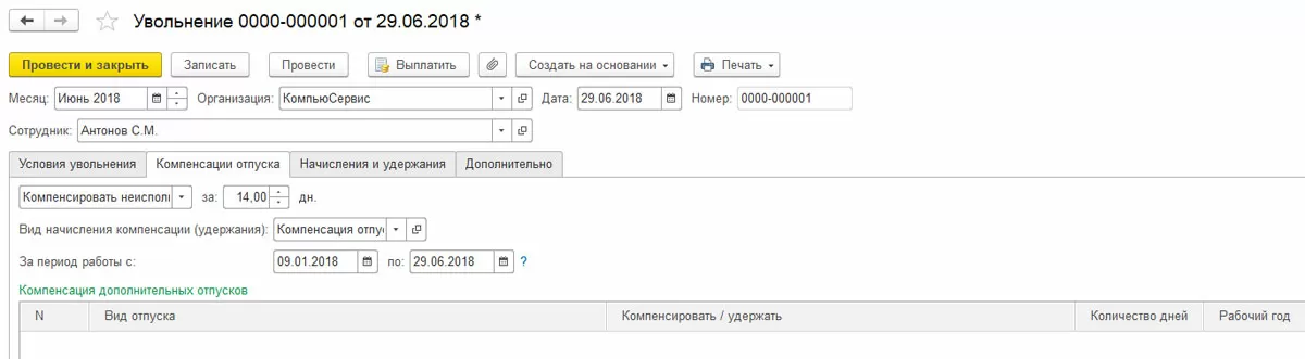 Рассчитанная сумма компенсации будет в поле «Компенсация отпуска».