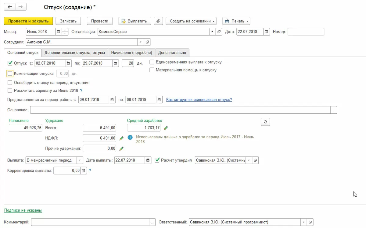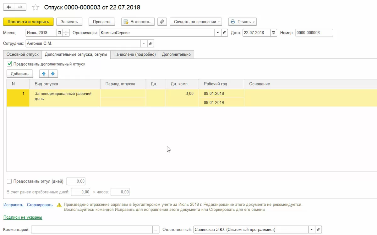 На вкладке «Начислено (подробно)» появится начисление «Компенсация отпуска (за ненормированный рабочий день)». После указания данных в документе «Отпуск» нажать на «Провести и закрыть».