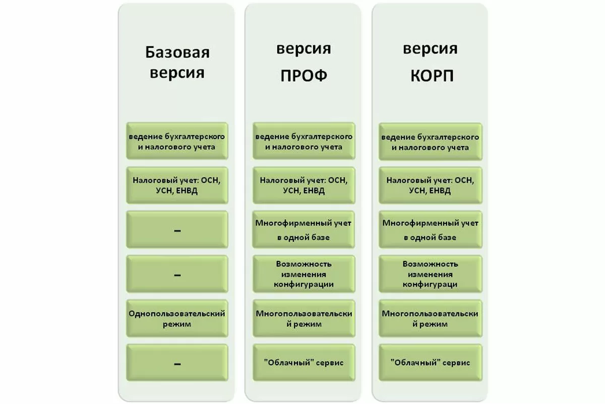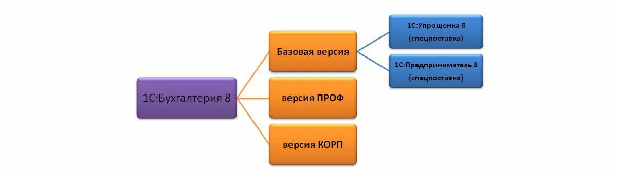 Далее перечислены версии 1С:Бухгалтерии в порядке возрастания их функционала.