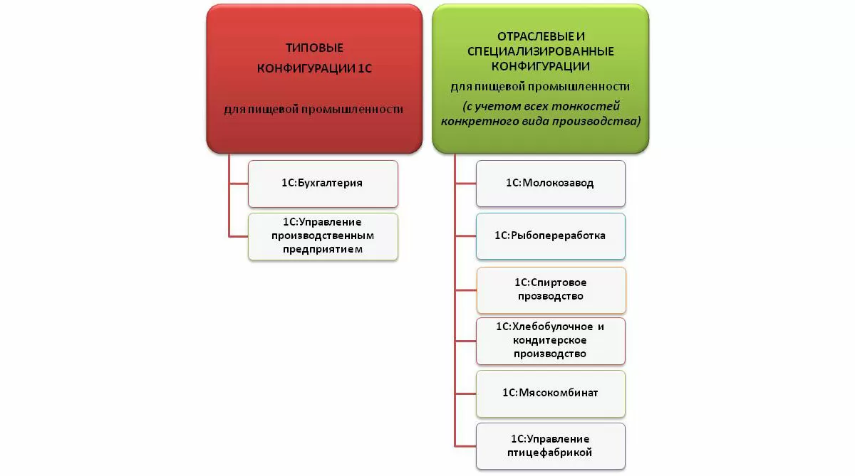 Примеры отраслевых конфигураций: 1С:Общепит, 1С:Управление сельхозпредприятием, 1С:Управление строительной организацией.